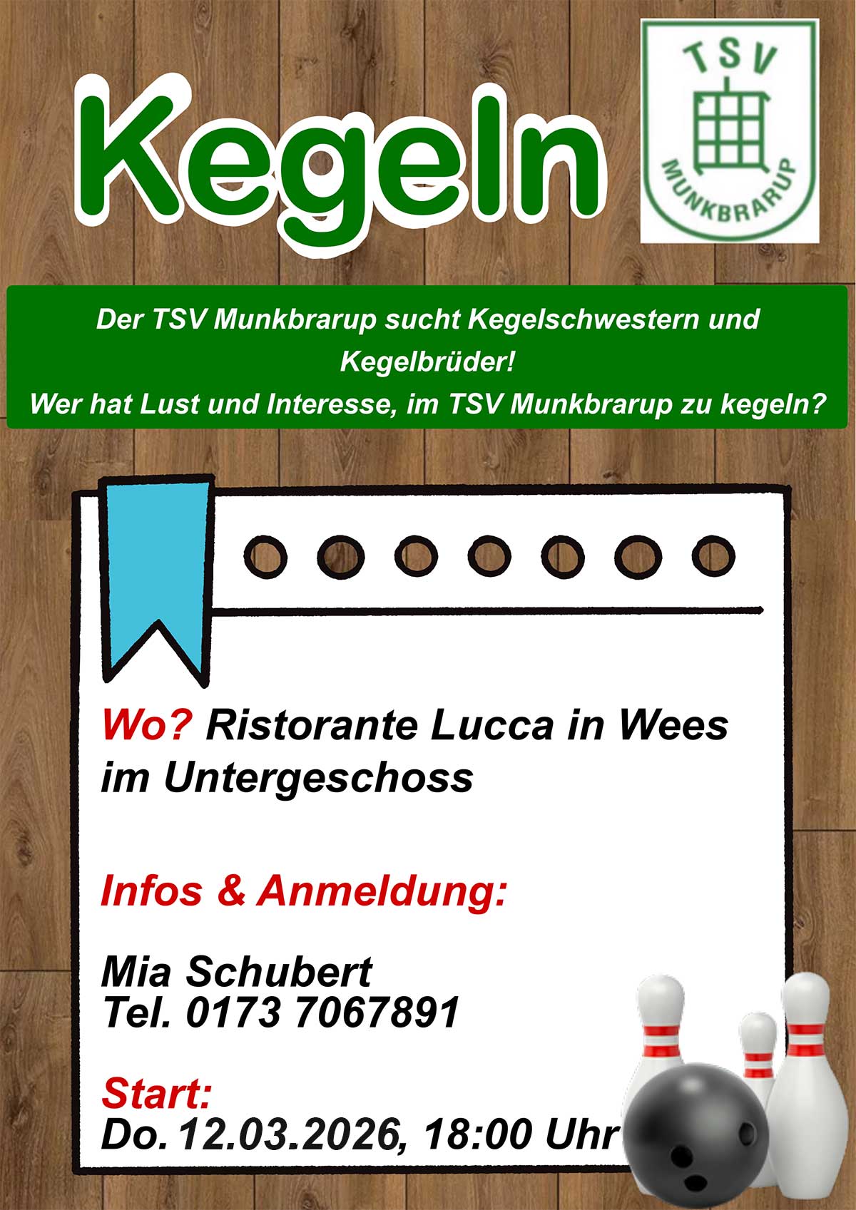 Eine ruhige Kugel schieben war gestern – jetzt wird gekegelt, und der TSV Munkbrarup möchte zu diesem Zweck eine Kegelsparte gründen!